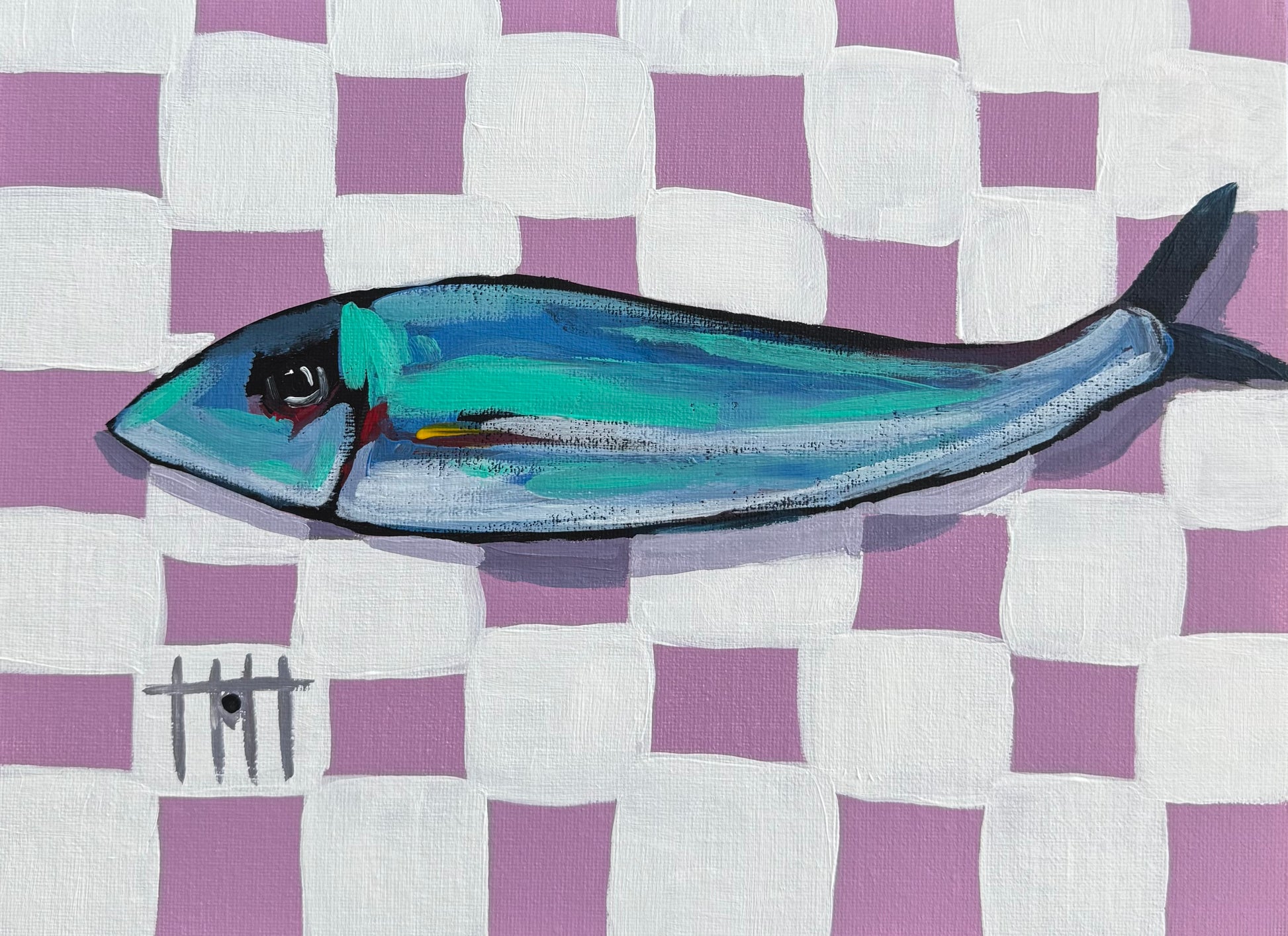 Fish on a purple and white checkerboard background